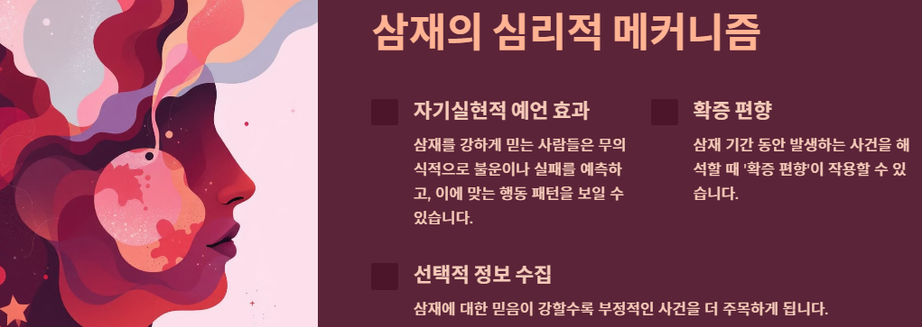 삼재를 강하게 믿는 사람들은 무의식적으로 불운이나 실패를 예측하고, 이에 맞는 행동 패턴을 보일 가능성이 큽니다. 이는 자기실현적 예언(self-fulfilling prophecy)의 한 예로, 부정적인 기대가 실제 현실로 나타나게 만듭니다.