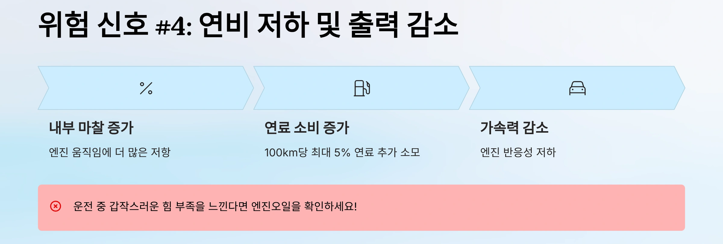 | 오일 장기 미교체 | 점도 저하, 슬러지 생성 |