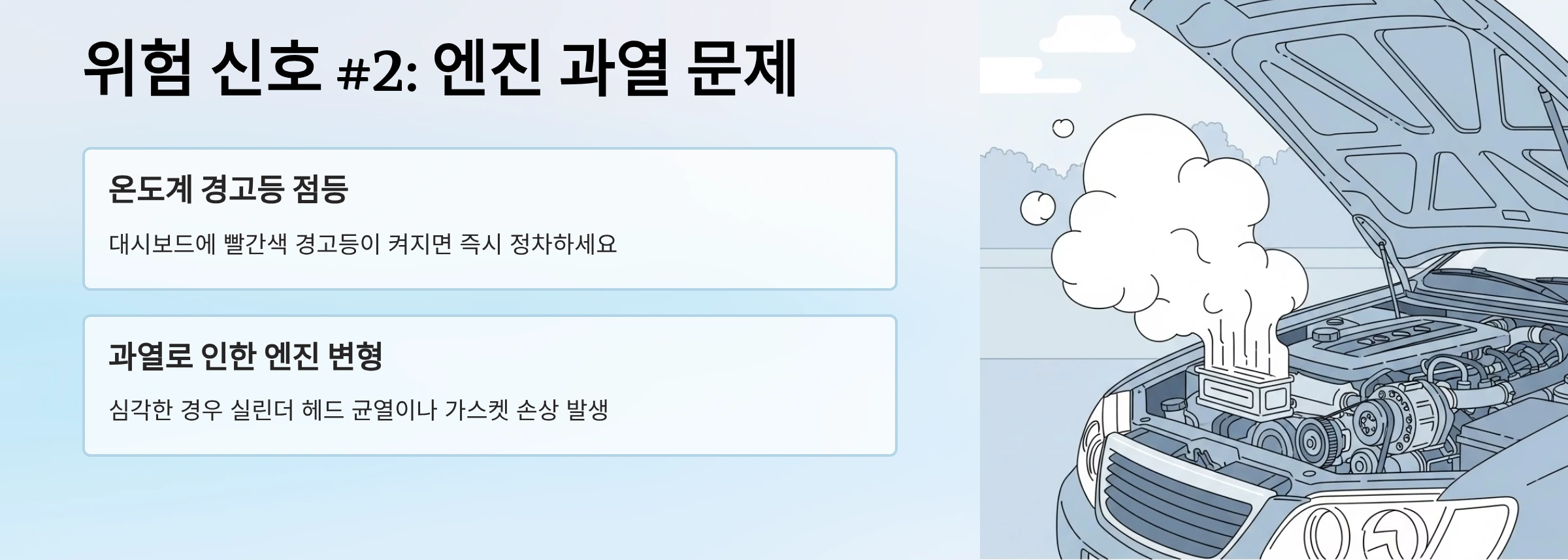 엔진이 과열되면 차 내부 경고등이 먼저 들어오지만, 운전자가 이를 무시하고 주행을 계속하게 되면 실린더 헤드가 휘거나, 가스켓이 손상돼 냉각수가 엔진 내부로 유입될 수 있어요. 이 상태가 심화되면 엔진 블로우 현상까지 발생할 수 있고, 사실상 엔진 교체가 필요해질 수도 있답니다.