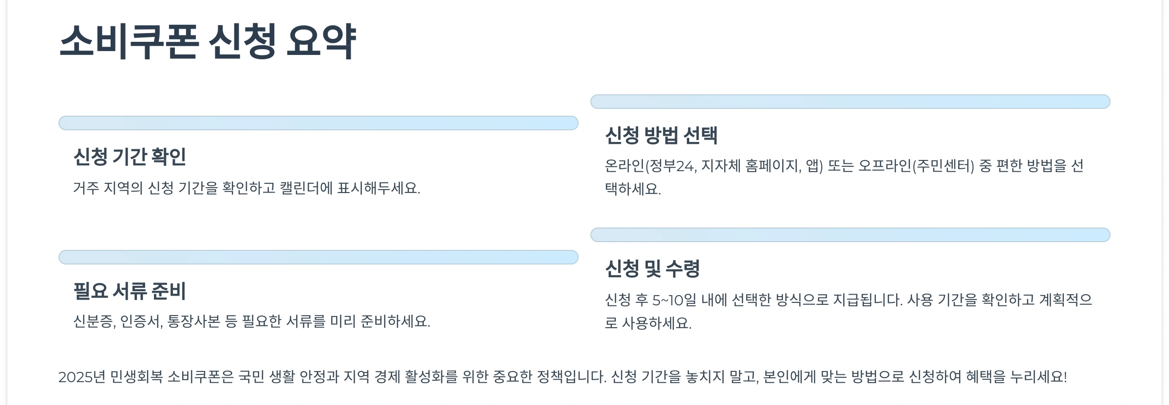 소비쿠폰은 꼭 신청해야만 받을 수 있어요! 자동으로 지급되지 않기 때문에, 신청 기간을 놓치면 아무리 자격이 되더라도 혜택을 받을 수 없어요. 특히 바쁜 일상 속에서 ‘나중에 해야지’ 하다 보면 신청 마감일이 훌쩍 지나가니까, 꼭 캘린더에 표시해두는 걸 추천해요 🗓
